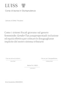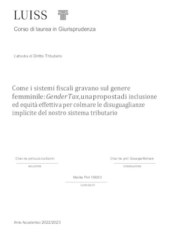 Pirri, Marika (A.A. 2021/2022) Come i sistemi fiscali gravano sul genere femminile: gender tax, una proposta di inclusione ed equità effettiva per colmare le disuguaglianze implicite del nostro sistema tributario. Tesi di Laurea in Diritto tributario, Luiss Guido Carli, relatore Livia Salvini, pp. 147. [Single Cycle Master's Degree Thesis]