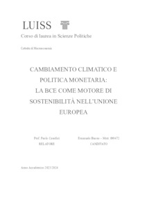 Buono, Emanuele (A.A. 2023/2024) Cambiamento climatico e politica monetaria: la BCE come motore di sostenibilità nell'Unione europea. Tesi di Laurea in Macroeconomia, Luiss Guido Carli, relatore Paolo Canofari, pp. 77. [Bachelor's Degree Thesis]