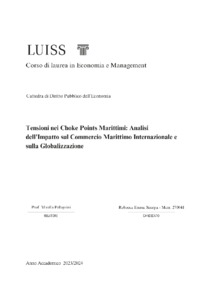 Scarpa, Rebecca Emma (A.A. 2023/2024) Tensioni nei choke points marittimi: analisi dell'impatto sul commercio marittimo interazionale e sulla globalizzazione. Tesi di Laurea in Diritto pubblico dell'economia, Luiss Guido Carli, relatore Mirella Pellegrini, pp. 74. [Bachelor's Degree Thesis]