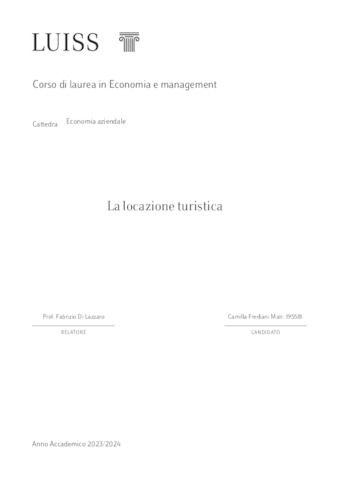 Frediani, Camilla (A.A. 2023/2024) La locazione turistica. Tesi di Laurea in Economia aziendale, Luiss Guido Carli, relatore Fabrizio Di Lazzaro, pp. 39. [Bachelor's Degree Thesis]