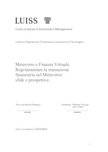 Piscopo, Raffaele (A.A. 2023/2024) Metaverso e finanza virtuale: regolamentare la transazione finanziaria nel metaverso: sfide e prospettive. Tesi di Laurea in Regolazione finanziaria e innovazione, Luiss Guido Carli, relatore Mirella Pellegrini, pp. 87. [Bachelor's Degree Thesis]
