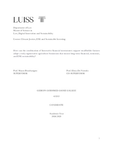 Galizzi, Gideon Godfred Gaisie (A.A. 2024/2025) How can the combination of innovative financial instruments support smallholder farmers adopt a truly regenerative agriculture businesses that ensure long-term financial, economic and ESG sustainability? Tesi di Laurea in Climate justice, ESG & sustainable investing, Luiss Guido Carli, relatore Mauro Bombacigno, pp. 93. [Master's Degree Thesis]