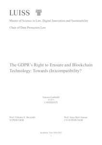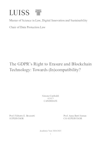 Garibaldi, Simone (A.A. 2024/2025) The GDPR’s right to erasure and blockchain technology: towards (in)compatibility? Tesi di Laurea in Data protection law, Luiss Guido Carli, relatore Filiberto Brozzetti, pp. 75. [Master's Degree Thesis]