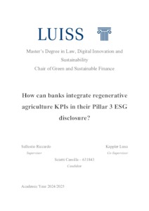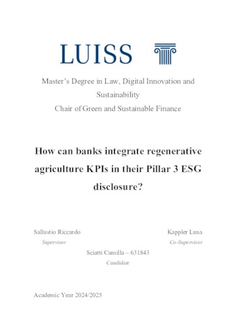 Sciatti, Camilla (A.A. 2024/2025) How can banks integrate regenerative agriculture KPIs in their Pillar 3 ESG disclosure? Tesi di Laurea in Green & sustainable finance, Luiss Guido Carli, relatore Riccardo Sallustio, pp. 102. [Master's Degree Thesis]