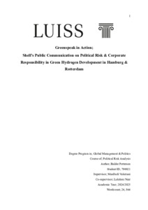 Pettersen, Balder (A.A. 2024/2025) Greenspeak in action: shell’s public communication on political risk & corporate responsibility in green hydrogen development in Hamburg & Rotterdam. Tesi di Laurea in Political risk analysis, Luiss Guido Carli, relatore Manfredi Valeriani, pp. 86. [Master's Degree Thesis]
