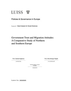 Gibson Junicosa, Cala Anne (A.A. 2024/2025) Government trust and migration attitudes: a comparative study of Northern and Southern Europe. Tesi di Laurea in Data analysis for social sciences, Luiss Guido Carli, relatore Davide Angelucci, pp. 50. [Master's Degree Thesis]