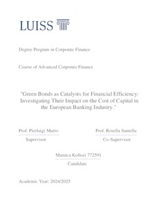 Kollozi, Mamica (A.A. 2024/2025) Green bonds as catalysts for financial efficiency: investigating their impact on the cost of capital in the European banking industry. Tesi di Laurea in Advanced corporate finance, Luiss Guido Carli, relatore Pierluigi Murro, pp. 55. [Master's Degree Thesis]