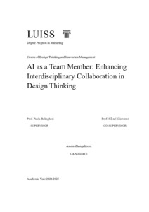 Zhangaliyeva, Assem (A.A. 2024/2025) AI as a team member: enhancing interdisciplinary collaboration in design thinking. Tesi di Laurea in Design thinking and innovation management, Luiss Guido Carli, relatore Paola Belingheri, pp. 87. [Master's Degree Thesis]