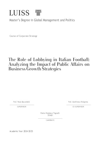 Paradossi Tognelli, Pietro (A.A. 2024/2025) The role of lobbying in Italian football: analyzing the impact of public affairs on business growth strategies. Tesi di Laurea in Corporate strategy, Luiss Guido Carli, relatore Paolo Boccardelli, pp. 155. [Master's Degree Thesis]