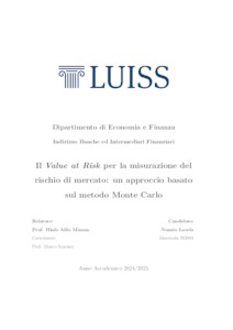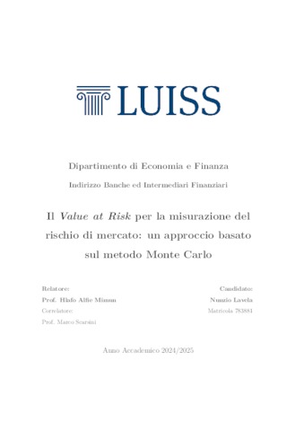 Lavela, Nunzio (A.A. 2024/2025) Il value at risk per la misurazione del rischio di mercato: un approccio basato sul metodo Monte Carlo. Tesi di Laurea in Probabilità e applicazioni alla finanza, Luiss Guido Carli, relatore Hlafo Alfie Mimun, pp. 196. [Master's Degree Thesis]