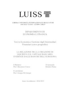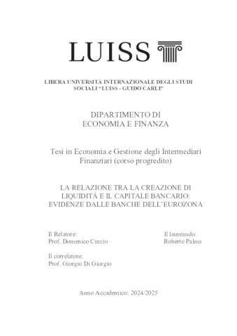 Palma, Roberto (A.A. 2024/2025) La relazione tra la creazione di liquidità e il capitale bancario: evidenze dalle banche dell’eurozona. Tesi di Laurea in Economia e gestione degli intermediari finanziari (corso progredito), Luiss Guido Carli, relatore Domenico Curcio, pp. 120. [Master's Degree Thesis]