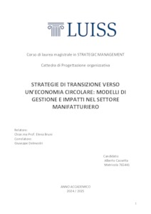 Cassetta, Alberto (A.A. 2024/2025) Strategie di transizione verso un’economia circolare: modelli di gestione e impatti nel settore manifatturiero. Tesi di Laurea in Progettazione organizzativa, Luiss Guido Carli, relatore Elena Bruni, pp. 68. [Master's Degree Thesis]