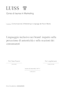 De Bonis, Sabrina (A.A. 2024/2025) Linguaggio inclusivo nei brand: impatto sulla percezione di autenticità e sulle reazioni dei consumatori. Tesi di Laurea in Comunicazione di marketing e linguaggi dei nuovi media, Luiss Guido Carli, relatore Paolo Peverini, pp. 156. [Master's Degree Thesis]
