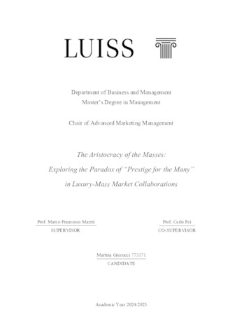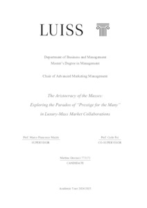 Grecucci, Martina (A.A. 2024/2025) The aristocracy of the masses: exploring the paradox of prestige for the many in luxury-mass market collaborations. Tesi di Laurea in Advanced marketing management, Luiss Guido Carli, relatore Marco Francesco Mazzù, pp. 70. [Master's Degree Thesis]
