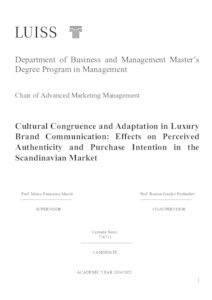 Nesci, Carmela (A.A. 2024/2025) Cultural congruence and adaptation in luxury brand communication: effects on perceived authenticity and purchase intention in the Scandinavian market. Tesi di Laurea in Advanced marketing management, Luiss Guido Carli, relatore Marco Francesco Mazzù, pp. 61. [Master's Degree Thesis]