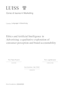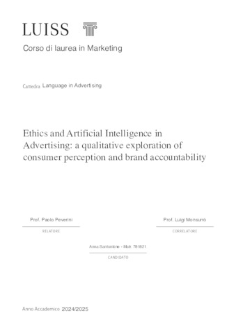 Santunione, Anna (A.A. 2024/2025) Ethics and artificial intelligence in advertising: a qualitative exploration of consumer perception and brand accountability. Tesi di Laurea in Language in advertising, Luiss Guido Carli, relatore Paolo Peverini, pp. 226. [Master's Degree Thesis]