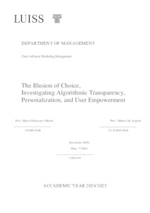 Belli, Alessandro (A.A. 2024/2025) The illusion of choice, investigating algorithmic transparency, personalization and user empowerment. Tesi di Laurea in Advanced marketing management, Luiss Guido Carli, relatore Marco Francesco Mazzù, pp. 56. [Master's Degree Thesis]
