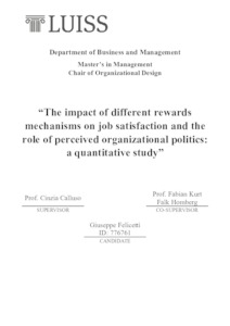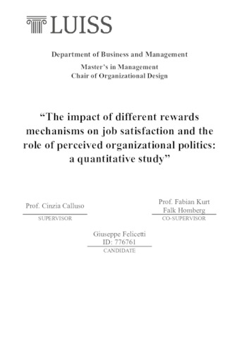 Felicetti, Giuseppe (A.A. 2024/2025) The impact of different rewards mechanisms on job satisfaction and the role of perceived organizational politics: a quantitative study. Tesi di Laurea in Organizational design, Luiss Guido Carli, relatore Cinzia Calluso, pp. 58. [Master's Degree Thesis]