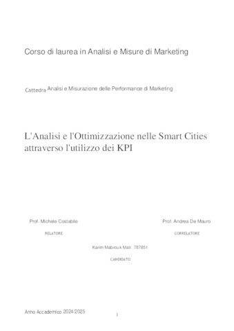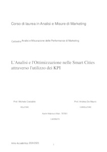 Mabrouk, Karim (A.A. 2024/2025) L'analisi e l'ottimizzazione nelle smart cities attraverso l'utilizzo dei KPI. Tesi di Laurea in Analisi e misurazione delle performance di marketing-marketing metrics, Luiss Guido Carli, relatore Michele Costabile, pp. 83. [Master's Degree Thesis]