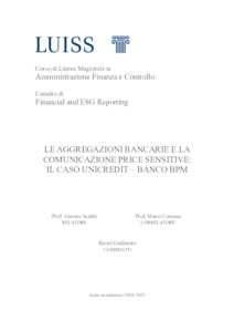Gialloreto, Raoul (A.A. 2024/2025) Le aggregazioni bancarie e la comunicazione price sensitive: il caso UniCredit-Banco BPM. Tesi di Laurea in Financial and ESG reporting, Luiss Guido Carli, relatore Simone Scettri, pp. 103. [Master's Degree Thesis]