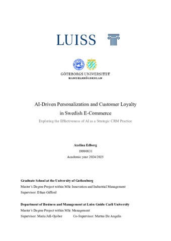 Edberg, Ebba Axelina Augusta (A.A. 2024/2025) AI-driven personalization and customer loyalty in Swedish e-commerce: exploring the effectiveness of AI as a strategic CRM practice. Tesi di Laurea in Corporate strategy, Luiss Guido Carli, relatore Maria Jell-Ojobor, pp. 97. [Master's Degree Thesis]