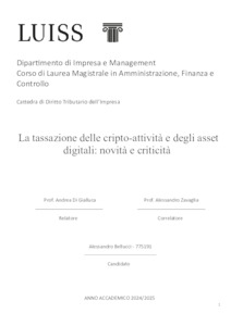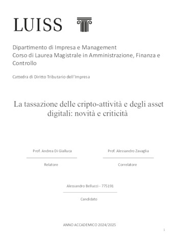 Bellucci, Alessandro (A.A. 2024/2025) La tassazione delle cripto-attività e degli asset digitali: novità e criticità. Tesi di Laurea in Diritto tributario dell'impresa, Luiss Guido Carli, relatore Andrea Di Gialluca, pp. 146. [Master's Degree Thesis]