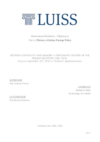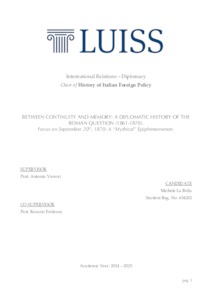 La Bella, Michele (A.A. 2024/2025) Between continuity and memory: a diplomatic history of the roman question (1861-1870): focus on september 20th, 1870: a mythical epiphenomenon. Tesi di Laurea in History of Italian foreign policy, Luiss Guido Carli, relatore Antonio Varsori, pp. 265. [Master's Degree Thesis]