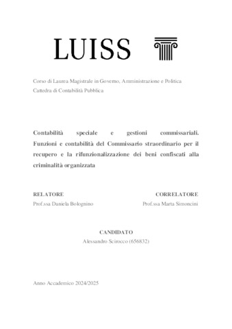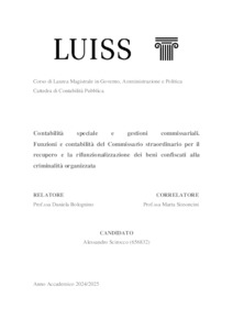 Scirocco, Alessandro (A.A. 2024/2025) Contabilità speciale e gestioni commissariali: funzioni e contabilità del commissario straordinario per il recupero e la rifunzionalizzazione dei beni confiscati alla criminalità organizzata. Tesi di Laurea in Contabilità pubblica, Luiss Guido Carli, relatore Daniela Bolognino, pp. 144. [Master's Degree Thesis]