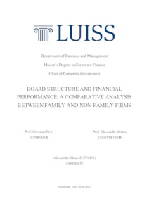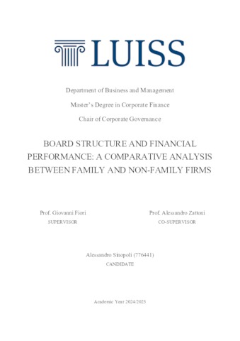 Sinopoli, Alessandro (A.A. 2024/2025) Board structure and financial performance: a comparative analysis between family and non-family firms. Tesi di Laurea in Corporate governance, Luiss Guido Carli, relatore Giovanni Fiori, pp. 83. [Master's Degree Thesis]