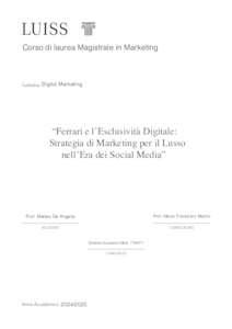 Gaudenzi, Simone (A.A. 2024/2025) Ferrari e l’esclusività digitale: strategia di marketing per il lusso nell’era dei social media. Tesi di Laurea in Digital marketing, Luiss Guido Carli, relatore Matteo De Angelis, pp. 91. [Master's Degree Thesis]