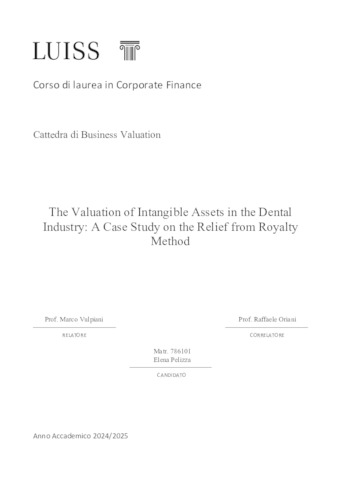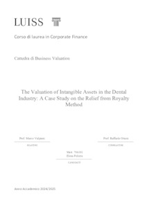 Pelizza, Elena (A.A. 2024/2025) The valuation of intangible assets in the dental industry: a case study on the relief from royalty method. Tesi di Laurea in Business valuation, Luiss Guido Carli, relatore Marco Vulpiani, pp. 83. [Master's Degree Thesis]