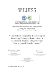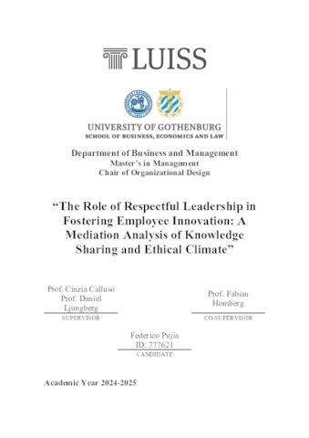 Pujia, Federico (A.A. 2024/2025) The role of respectful leadership in fostering employee innovation: a mediation analysis of knowledge sharing and ethical climate. Tesi di Laurea in Organizational design, Luiss Guido Carli, relatore Cinzia Calluso, pp. 86. [Master's Degree Thesis]