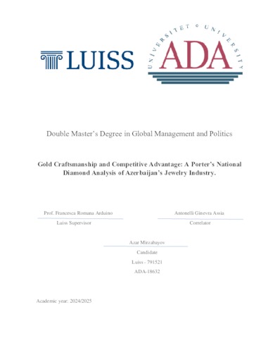 Mirzabayov, Azar Azad Oglu (A.A. 2024/2025) Gold craftsmanship and competitive advantage: a Porter’s national diamond analysis of Azerbaijan’s jewelry industry. Tesi di Laurea in Corporate strategy, Luiss Guido Carli, relatore Francesca Romana Arduino, pp. 43. [Master's Degree Thesis]