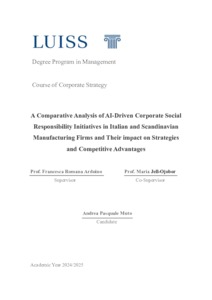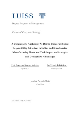 Muto, Andrea Pasquale (A.A. 2024/2025) A comparative analysis of AI-driven corporate social responsibility initiatives in Italian and Scandinavian manufacturing firms and their impact on strategies and competitive advantages. Tesi di Laurea in Corporate strategy, Luiss Guido Carli, relatore Francesca Romana Arduino, pp. 128. [Master's Degree Thesis]