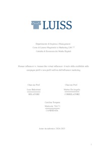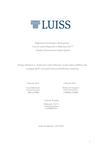 Tempera, Carolina (A.A. 2024/2025) Human influencer vs. human-like virtual influencer: il ruolo della credibilità nelle campagne profit e non-profit nell'era dell'influencer marketing. Tesi di Laurea in Economia dei media digitali, Luiss Guido Carli, relatore Luca Balestrieri, pp. 95. [Master's Degree Thesis]