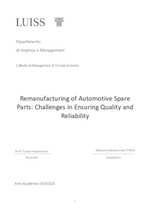 Matrone, Antonio (A.A. 2024/2025) Remanufacturing of automotive spare parts: challenges in ensuring quality and reliability. Tesi di Laurea in Management of circular economy, Luiss Guido Carli, relatore Tiziano Volpentesta, pp. 53. [Master's Degree Thesis]