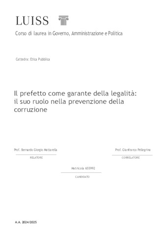 Francone, Andrea Pierfelice (A.A. 2024/2025) Il prefetto come garante della legalità: il suo ruolo nella prevenzione della corruzione. Tesi di Laurea in Etica pubblica, Luiss Guido Carli, relatore Bernardo Giorgio Mattarella, pp. 138. [Master's Degree Thesis]