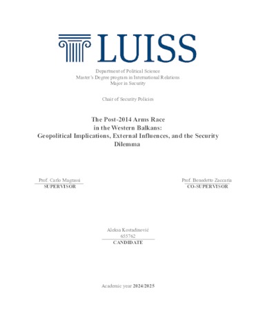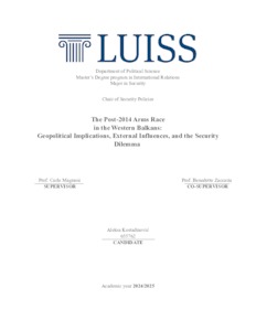 Kostadinovic, Aleksa (A.A. 2024/2025) The post-2014 arms race in the Western Balkans: geopolitical implications, external influences and the security dilemma. Tesi di Laurea in Security policies, Luiss Guido Carli, relatore Carlo Magrassi, pp. 178. [Master's Degree Thesis]