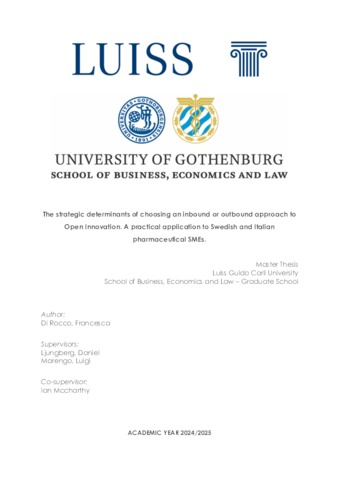 Di Rocco, Francesca (A.A. 2024/2025) The strategic determinants of choosing an inbound or outbound approach to open innovation: a practical application to Swedish and Italian pharmaceutical SMEs. Tesi di Laurea in Managerial decision making, Luiss Guido Carli, relatore Luigi Marengo, pp. 80. [Master's Degree Thesis]