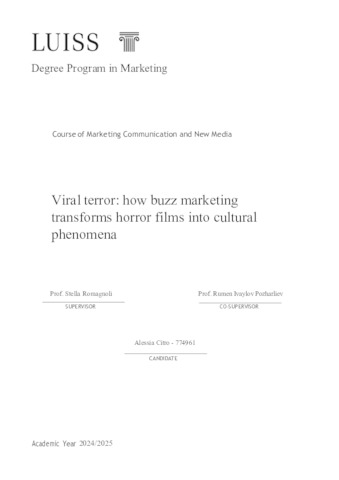 Citro, Alessia (A.A. 2024/2025) Viral terror: how buzz marketing transforms horror films into cultural phenomena. Tesi di Laurea in Marketing communication & new media, Luiss Guido Carli, relatore Stella Romagnoli, pp. 106. [Master's Degree Thesis]