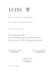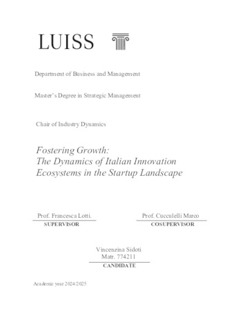 Sidoti, Vincenzina (A.A. 2024/2025) Fostering growth: the dynamics of Italian innovation ecosystems in the start-up landscape. Tesi di Laurea in Industry dynamics, Luiss Guido Carli, relatore Francesca Lotti, pp. 87. [Master's Degree Thesis]