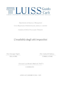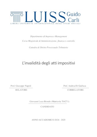 Biondo, Giovanni Luca (A.A. 2024/2025) L’invalidità degli atti impositivi. Tesi di Laurea in Diritto processuale tributario, Luiss Guido Carli, relatore Giuseppe Napoli, pp. 70. [Master's Degree Thesis]