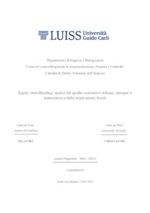 Pappalardo, Andrea (A.A. 2024/2025) Equity crowdfunding: analisi del quadro normativo italiano, europeo e statunitense e delle implicazioni fiscali. Tesi di Laurea in Diritto tributario dell'impresa, Luiss Guido Carli, relatore Andrea Di Gialluca, pp. 133. [Master's Degree Thesis]