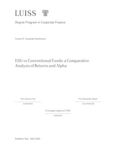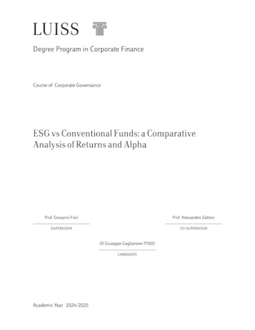 Gaglianone, Giuseppe (A.A. 2024/2025) ESG vs conventional funds: a comparative analysis of returns and alpha. Tesi di Laurea in Corporate governance, Luiss Guido Carli, relatore Giovanni Fiori, pp. 40. [Master's Degree Thesis]