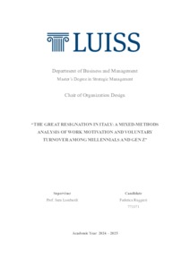 Ruggieri, Federica (A.A. 2024/2025) The great resignation in Italy: a mixed-methods analysis of work motivation and voluntary turnover among Millennials and Gen Z. Tesi di Laurea in Organization design, Luiss Guido Carli, relatore Sara Lombardi, pp. 93. [Master's Degree Thesis]