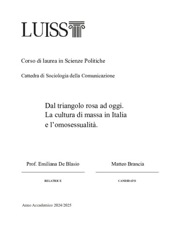 Brancia, Matteo (A.A. 2024/2025) Dal triangolo rosa ad oggi: la cultura di massa in Italia e l’omosessualità. Tesi di Laurea in Sociologia della comunicazione, Luiss Guido Carli, relatore Emiliana De Blasio, pp. 65. [Bachelor's Degree Thesis]
