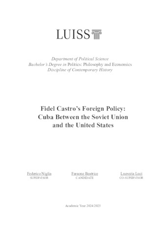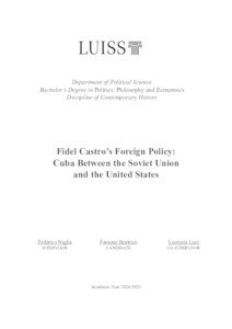 Faraone, Beatrice (A.A. 2024/2025) Fidel Castro’s foreign policy: Cuba between the Soviet Union and the United States. Tesi di Laurea in Contemporary history, Luiss Guido Carli, relatore Federico Niglia, pp. 77. [Bachelor's Degree Thesis]
