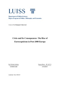Ristic, Tamara (A.A. 2024/2025) Crisis and its consequences: the rise of euroscepticism in post-2008 Europe. Tesi di Laurea in European union law, Luiss Guido Carli, relatore Robert Schuetze, pp. 1002. [Bachelor's Degree Thesis]