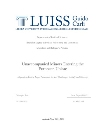 Tropea, Irene (A.A. 2024/2025) Unaccompanied minors entering the European Union: migration routes, legal frameworks and challenges in Italy and Norway. Tesi di Laurea in Migration and refugee policies, Luiss Guido Carli, relatore Christopher Hein, pp. 72. [Bachelor's Degree Thesis]