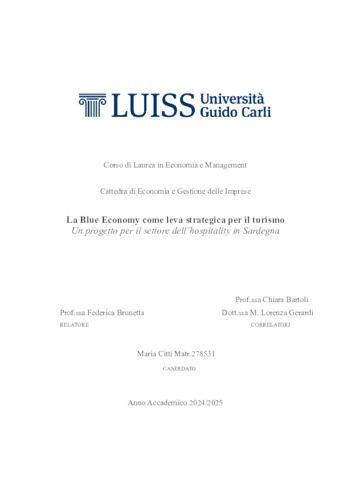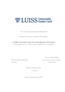 Citti, Maria (A.A. 2024/2025) La blue economy come leva strategica per il turismo: un progetto per il settore dell’hospitality in Sardegna. Tesi di Laurea in Economia e gestione delle imprese, Luiss Guido Carli, relatore Federica Brunetta, pp. 125. [Bachelor's Degree Thesis]